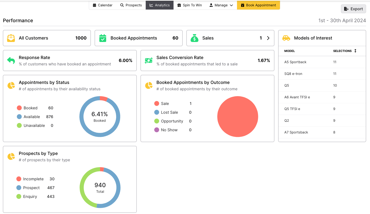 Here you will see a detailed view of various statistics from the event. At the top you will see specific metrics for Invited Guests, Booked Appointments, Sales Made, Response Rate and your Sales Conversation Rate. You can also see the number of times each vehicle model was selected by guests, and pie charts showing appointments by status, booked appointments by origin and Prospects by Type.