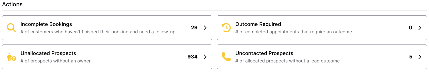 - Outcome Required shows the number of bookings which need an outcome (Sale, No Sale, Pending or No Show). Clicking on this takes you to the calendar and filters it for only appointments which need an outcome.