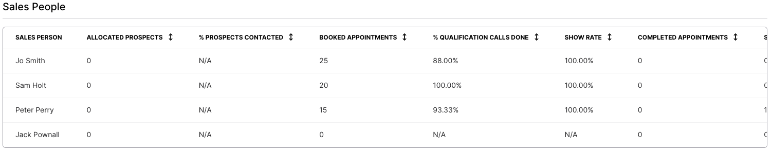 Scrolling down further shows your Sales People, allowing you to clearly see and compare your workforce. Scroll to the right to see further information including Sales and how many of their appointments require an outcome.