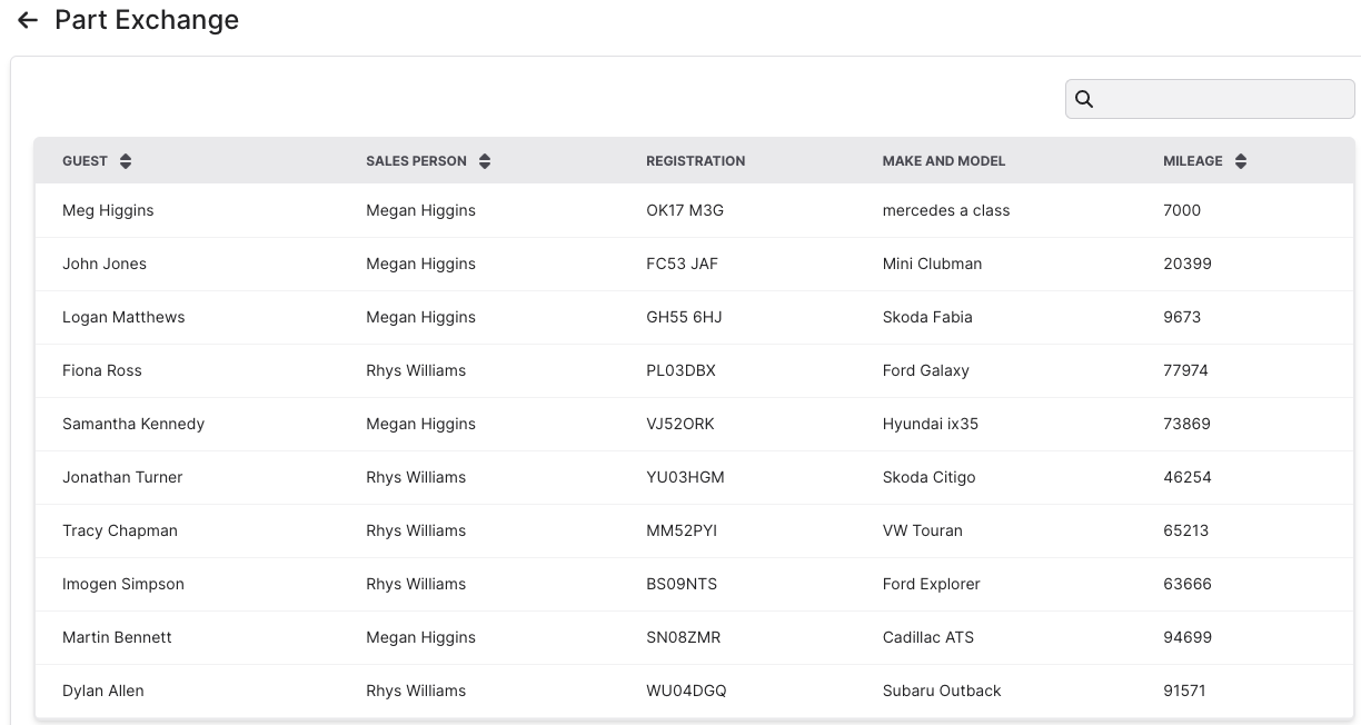 - Clicking on Part Exchange shows the guests who are interested in exchanging their vehicle and vehicle information.