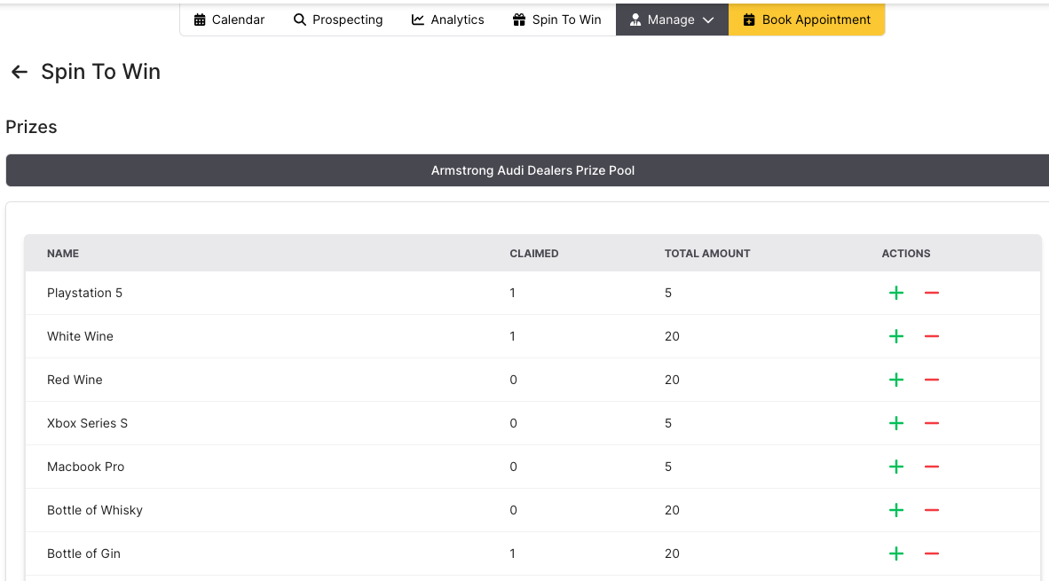 Here you can view all prizes alongside the remaining amount and how many have been claimed. You can also increase or decrease the total amount of prizes remaining by clicking + and - on the right.