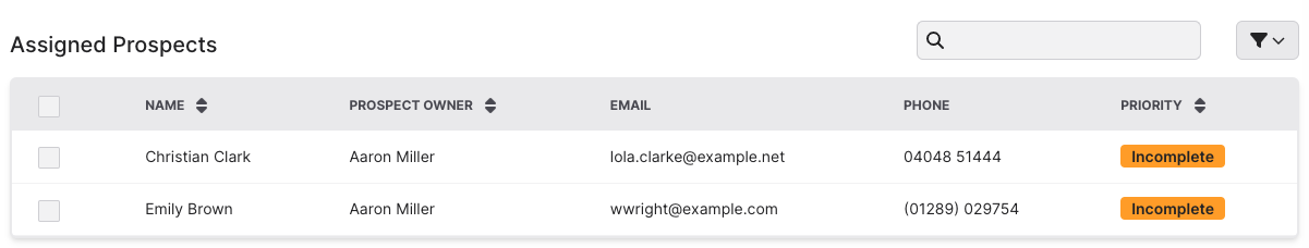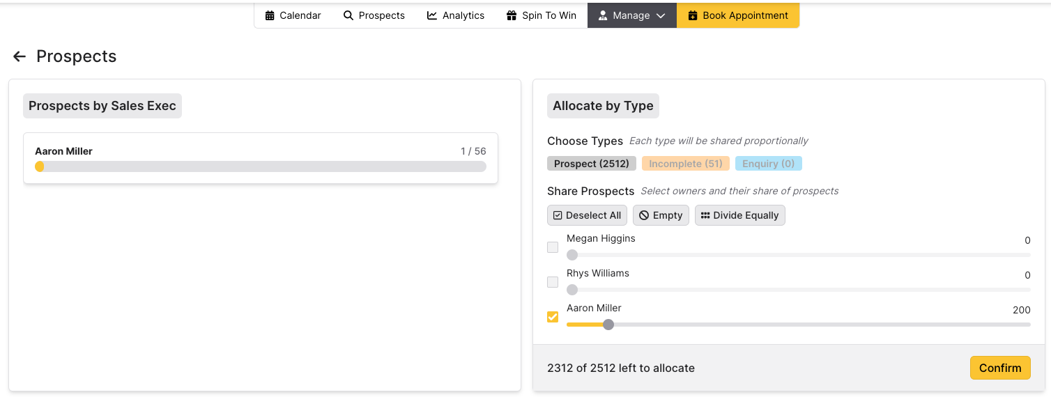 Here you can allocate prospects to each sales executive. You can allocate these prospects based on type. Prospects will automatically have their type updated to Incomplete if the guest has began booking an appointment but stopped before finishing.