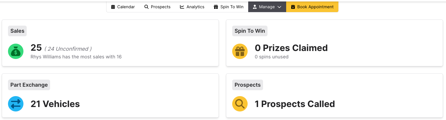 The manage tab gives a summary of Total Sales, Spin To Win, Part Exchange, and Prospects. Spin To Win will only appear if your event has the Spin To Win add-on. There will always be a prospects tab, although unless you have the prospects add-on it will be more limited.