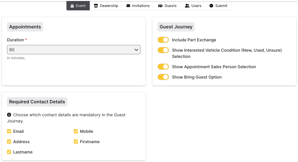 When you first access the Halo platform you will be asked to provide and confirm information about your dealership for the event. The information provided will be used on guest invitations and to set up your workforce.