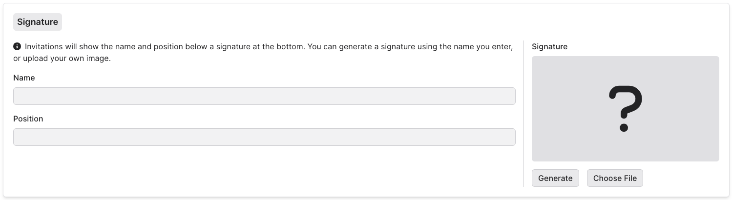 This section generates your signature for the bottom of guest invitation letters. You can upload an image of your main signature, or Halo can generate a signature using your name.